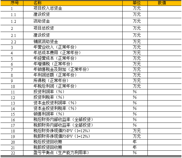 在总论部分中,可将研究报告中各部分的主要技术经济指标汇总,列出主要技术经济指标表,使审批和决策者对项目作全貌了解。