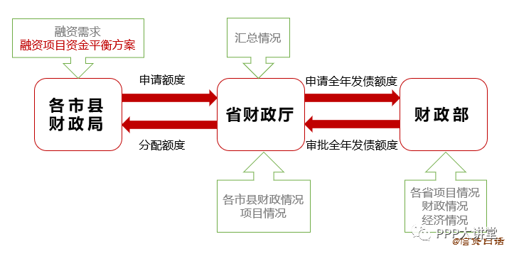 财政部根据各省的项目情况、财政情况、经济情况等各项因素后,审批该省的全年发债额度。省财政厅拿到全年额度后,再根据各市县的财政情况及项目情况,向各市县分配额度。