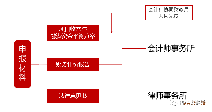 整个申报材料的制作,由财政局聘请各中介机构开展材料编写工作,各中介机构主要包括会计师事务所、律师事务所。各家的职能分别为: